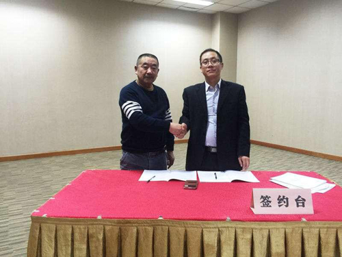 華中辦事處負(fù)責(zé)人陳馳(右)與優(yōu)秀經(jīng)銷(xiāo)商代表簽訂2016年?duì)I銷(xiāo)協(xié)議
