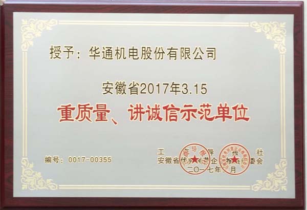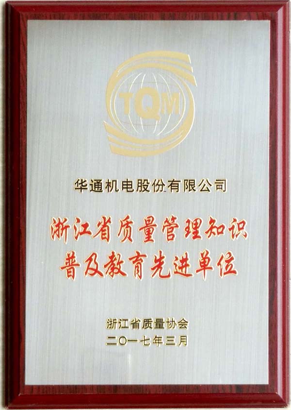 華通機電股份始終狠抓質(zhì)量管理,并獲得社會的一致肯定。近期,好評連連,繼被中國質(zhì)量協(xié)會、全國用戶委員會評為用戶滿意企業(yè)后,又被浙江省質(zhì)量協(xié)會評為質(zhì)量管理知識普及教育先進單位、被工商導報社、安徽省優(yōu)秀民營企業(yè)推展組委會評為安徽省2017年3.15重質(zhì)量、講誠信示范單位。