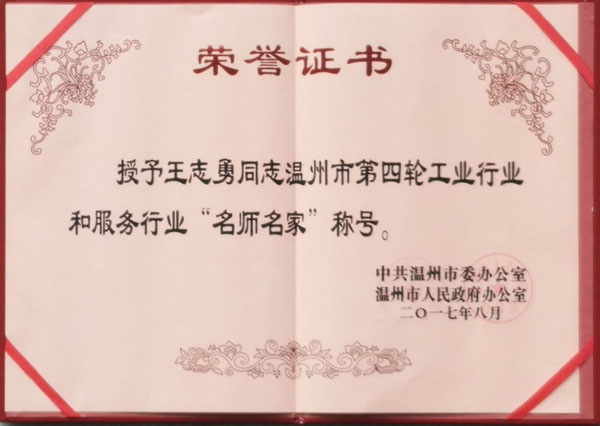 近日,公司技術(shù)中心高級(jí)工程師、共產(chǎn)黨員王志勇被溫州市委市政府評(píng)為溫州市百名“名師名家”榮譽(yù)稱號(hào)。