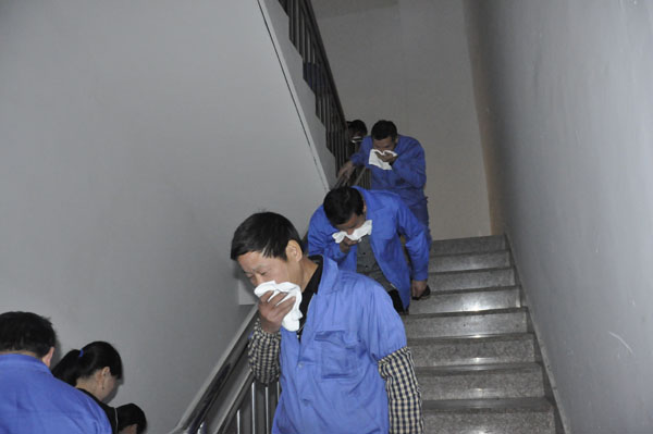 接著,模擬A幢六樓消防警報響起,所有參加演練人員立即緊急疏散,大家用毛巾捂住口鼻,俯下身,安全、快速有序的緊貼安全通道右側(cè)向廠區(qū)撤離,整個過程有條不紊,動作迅速,基本在合理的時間內(nèi)完成了快速疏散任務。