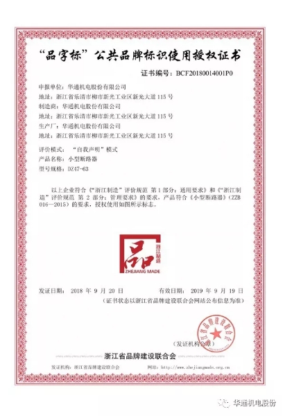 9月20日,經(jīng)浙江省品牌建設(shè)聯(lián)合會(huì)評(píng)定,華通機(jī)電股份榮獲“浙江制造”品字標(biāo)公共品牌標(biāo)識(shí)使用授權(quán)證書,是樂清市首家獲此殊榮的企業(yè)。