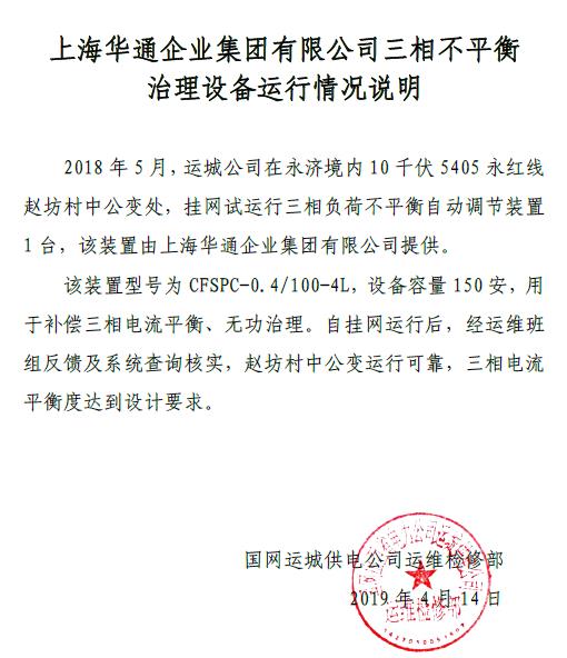 客戶的滿意,就是前行的動能。近日,又收到國家電網(wǎng)運(yùn)城供電公司關(guān)于使用華通CFSPC三相不平衡治理裝置的運(yùn)行情況說明,對于掛網(wǎng)運(yùn)行的型號為CFSPC-0.4/100-4L,設(shè)備容量150安的三相不平衡治理裝置,自2018年5月一年來的運(yùn)行,安全可靠,三相電流平衡主達(dá)到設(shè)計(jì)要求。這是自上次國家電網(wǎng)公司晉中供電公司對產(chǎn)品來函肯定外,又獲一客戶特意來函好評。