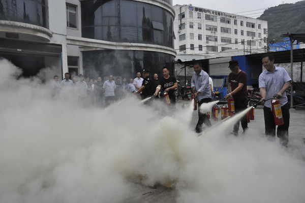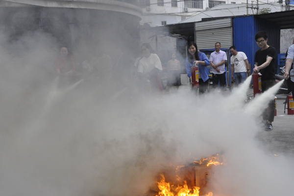 接著,公司消防管理員張心軍先后講解滅火器、消火栓的使用方法和技巧,并示范滅火,參演人員個個聽得非常認真,學得十分仔細。為讓參演人員親身感受滅火技能,特意模擬火場,用木塊燃起了一堆大火,讓每一位參演人員用滅火器直接滅火。頓時,現(xiàn)場白煙升騰,大火一次次點燃,瞬間又被一批批參演人員用滅火器秒殺熄滅。