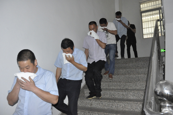最后,模擬一號樓二樓車間出現(xiàn)火情,所有參演人員立即在疏導員的引導下,從該車間進行緊急疏散。只見參演人員個個貓著腰,用毛巾捂住口鼻,快速有序的緊貼安全通道右側(cè)向廠區(qū)撤離,整個疏散過程秩序井然,并迅速撤離到了廠區(qū),基本達到了疏散演練的預期效果。